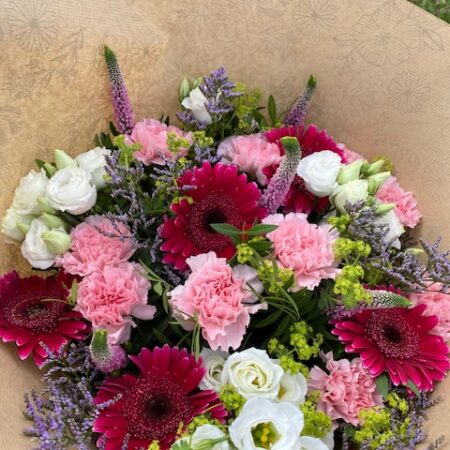 Bouquet de fleurs fraîches dans les tons pastel, réalisé par nos soins dans notre atelier avant d’être livré.