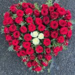 Cœur piqué avec roses rouges et blanches avec feuillage vert dans de la mousse hydrophile .